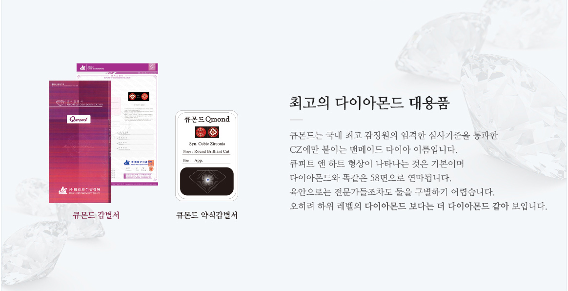 큐빅 지르코니아 원석의 특성을 그대로 다이아몬드의 1%에 해당되는 엑설런트급 컷팅 기술로 연마된 제품으로 가장 아름다운 다이아몬드의 빛을 그대로 재현해낸 특별한 제품입니다.